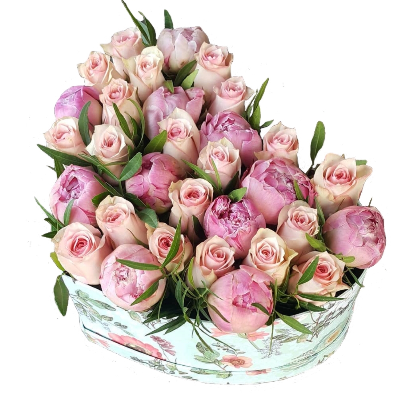 Букет состоит из 20 роз, 11 пионов, зелень, коробка в виде сердца, оазис.