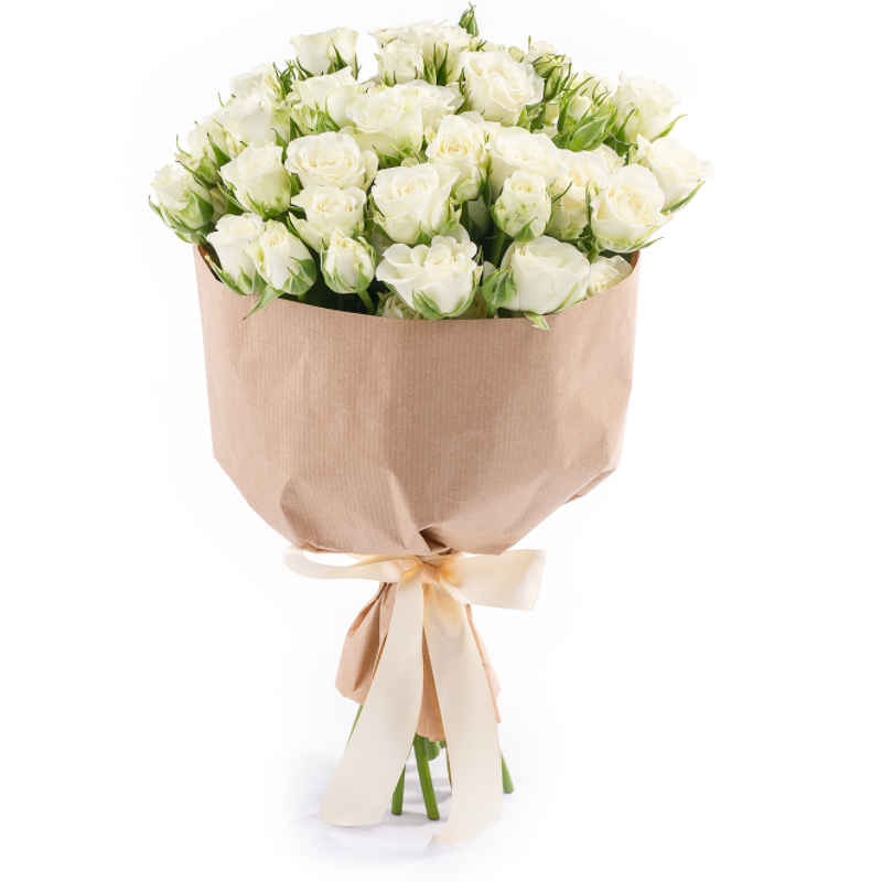 Букет состоит из 11 белых кустовых роз, крафт, атласная лента.